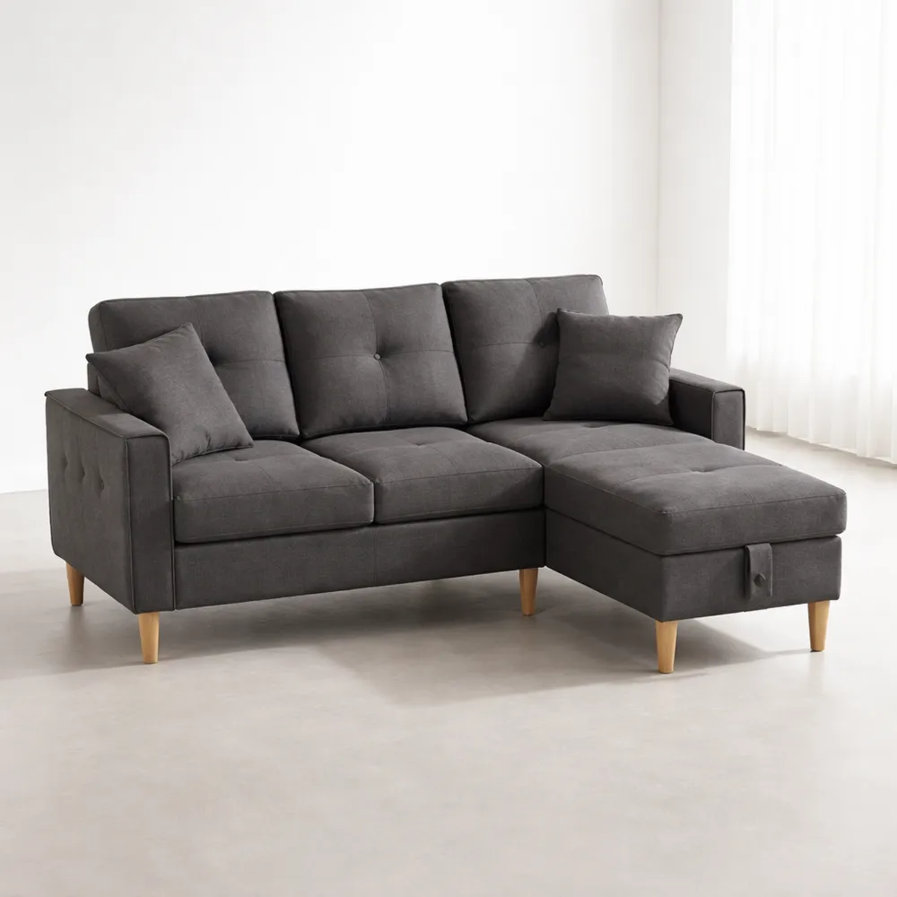 Divano angolare a forma di L con chaise longue reversibile. Il design flessibile consente di montare la chaise longue a sinistra o a destra a seconda delle esigenze della stanza. Adatto per soggiorno, appartamento o ufficio. Seduta con molle insacchettate: cuscini in schiuma e cotone PP con molle che offrono elasticità e comfort. Portabevande e tasche laterali: pratici portabevande e tasche per telecomando, telefono, riviste o tablet. Spazio nascosto ampio: sotto la seduta si possono riporre coperte, cuscini o oggetti quotidiani. Morbido tessuto di cotone con 2 cuscini inclusi: tessuto traspirante per tutte le stagioni con cuscini per ulteriore supporto per la schiena o la zona lombare.