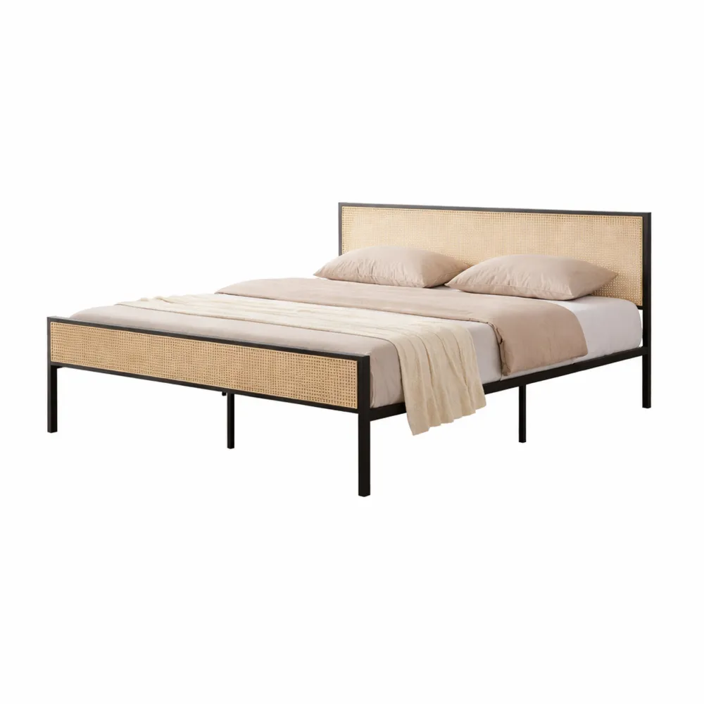Questo letto presenta una struttura in metallo con dettagli effetto rattan. Il design si adatta a diversi stili di arredamento, grazie alle linee moderne e ai richiami naturali. La struttura in acciaio verniciato a polvere di colore nero offre stabilità e una base robusta con doghe in metallo. La testiera e la pediera includono inserti in plastica intrecciata. Disponibile nelle misure 160x200 cm e 180x200 cm. Le doghe garantiscono un supporto uniforme, mentre la pediera mantiene il materasso in posizione. Spazio sottostante disponibile per riporre oggetti. Materasso non incluso. Supporto fino a 300 kg. Dimensioni: - Esterne (Lu x La x A): 206 x 165 x 90 cm - Materasso adatto: 200 x 160 cm - Distanza doghe dal pavimento: 30 cm - Testiera (A): 90 cm - Pediera (A): 49 cm Materiali: - Struttura: acciaio verniciato a polvere - Testiera, Pediera: intreccio in plastica Colori: - Struttura: nero, opaco - Testiera, Pediera: effetto rattan
