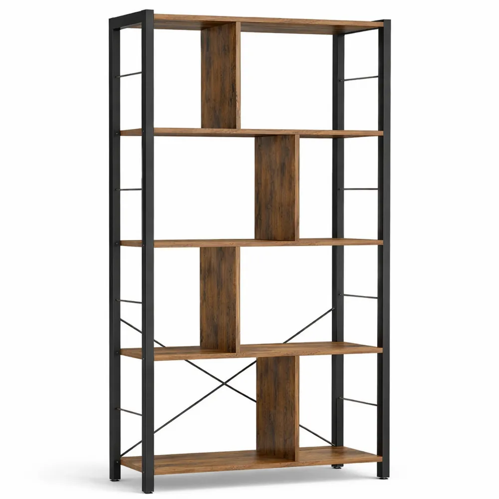 Questa libreria presenta una combinazione di colori marrone e nero, adatta a diversi ambienti della casa. La struttura in metallo e pannelli di truciolato garantisce stabilità, con ripiani che supportano fino a 20 kg ciascuno. Le barre posteriori a forma di X aggiungono robustezza, mentre quelle laterali evitano la caduta degli oggetti.