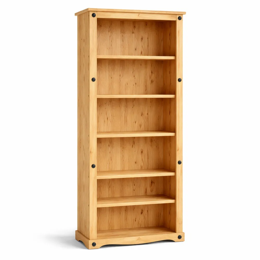Questa libreria presenta una struttura compatta realizzata in legno di pino anticato e trattato a cera. Misura 183 x 81 x 43 cm e include tre ripiani. È progettata nello stile messicano e può essere facilmente pulita con un panno asciutto.