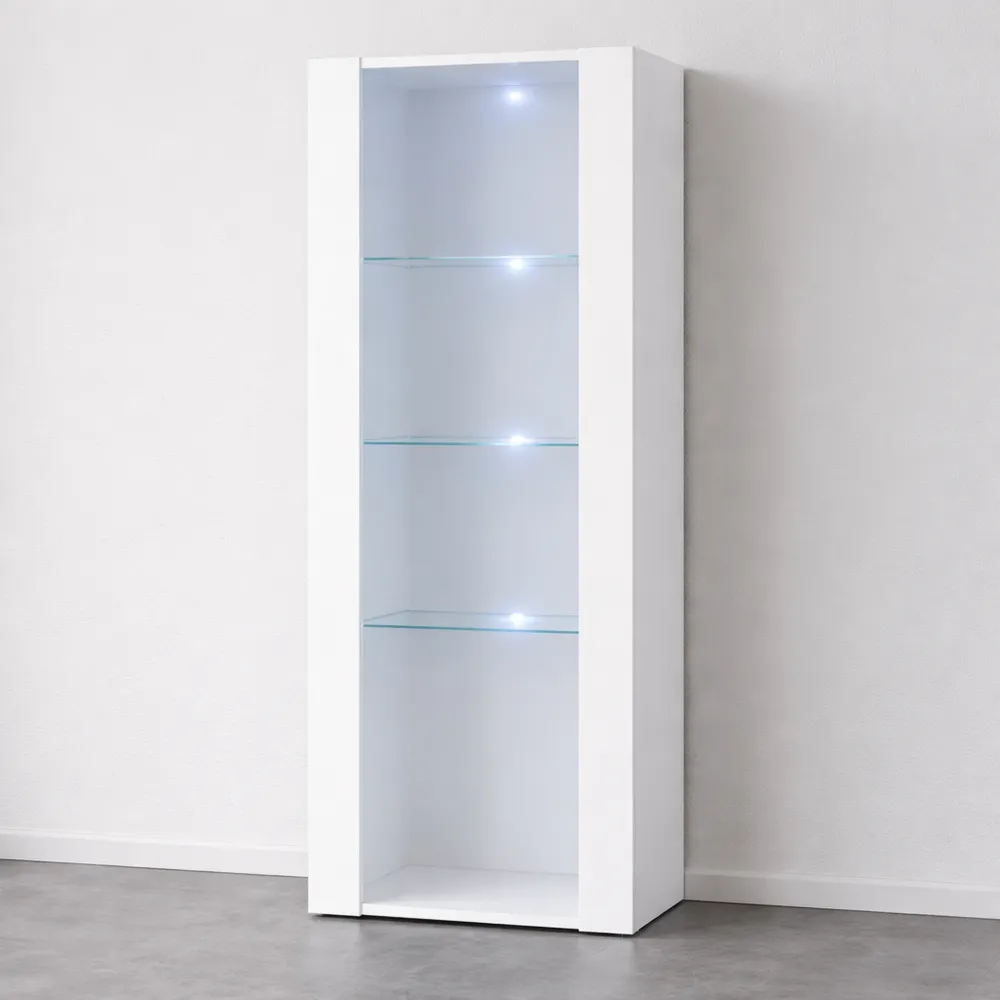 Scaffali ideali per la collocazione di collezioni, figurine, libri, dischi, documenti e giocattoli. L'assenza di ante facilita l'accesso agli oggetti. Adatto a saloni, biblioteche, camere per bambini, corridoi, ingressi e cucine. Realizzato in pannelli laminati resistenti all'abrasione e ai graffi. Dotato di 3 ripiani in vetro, ha un'illuminazione LED opzionale.